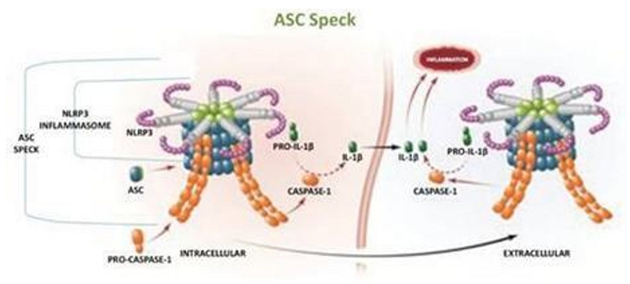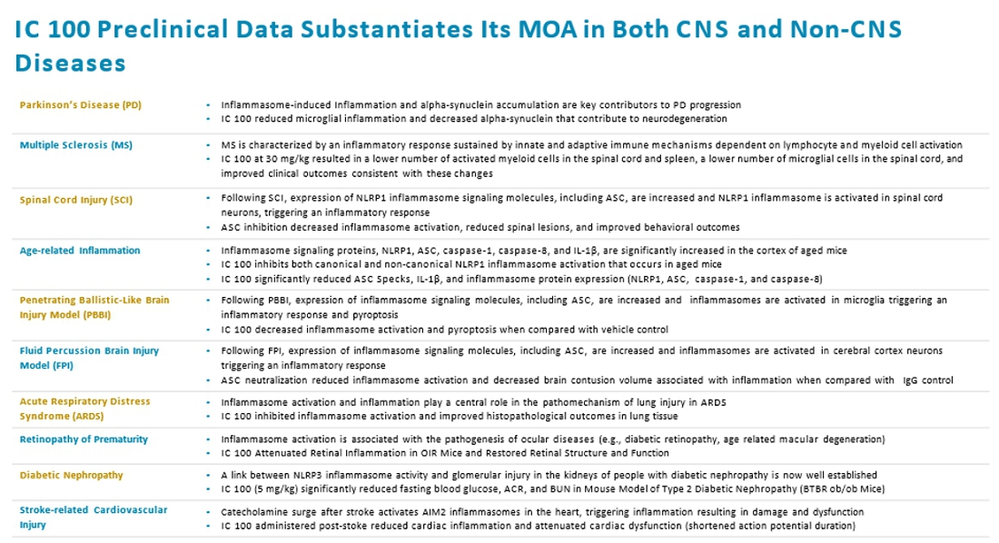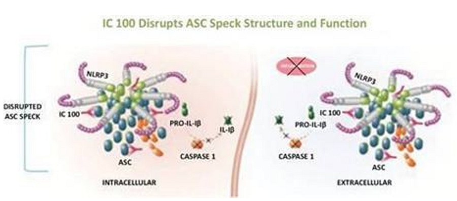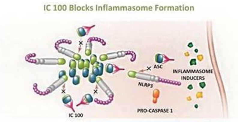 Inflammasomes are comprised of 3 proteins: (i) one of several types of sensor molecules, (ii) an apoptosis-associated speck-like protein containing a caspase recruitment domain (“ASC”), and (iii) proinflammatory caspase-1 (“pro-caspase-1”). There are multiple types of inflammasomes that trigger inflammation. They are named based on their associated sensor molecule, such as NLRP1, NLRP2, NLRP3, NLRC4, AIM2, and Pyrin. Numerous inflammatory diseases are often associated with activation of multiple types of inflammasomes. For example, obesity is associated with activation of AIM2 and NLRP3, insulin resistance is associated with AIM2, NLRP3, and NLRC4 and diabetic nephropathy is associated with activation of AIM2, NLRP3, and NLRC4. The ASC component of inflammasomes is a promising drug target since it is a component of the six most common types of inflammasomes referenced above. We believe targeting ASC is more effective than targeting a specific sensor protein such as NLRP3, that inhibits only one type of inflammasome. In addition to its pivotal role in inflammasome formation and activation required for initiation of an inflammatory response, ASC also plays a role in the perpetuation of inflammation associated with extracellular release of ASC specks. By targeting ASC, we believe IC 100 has potential to effectively control inflammation in a multitude of inflammatory diseases.