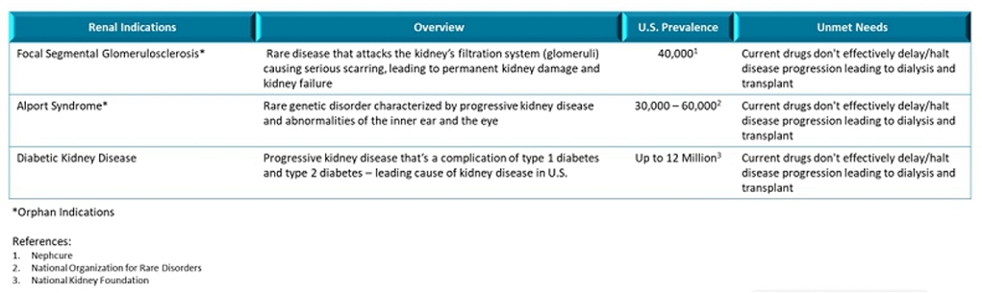Our lead renal indication is FSGS, which is a progressive form of kidney disease with no approved drug therapies. Approximately 40-60% of FSGS patients develop end stage kidney disease within 10-20 years, requiring dialysis and ultimately kidney transplant to survive. FSGS is an orphan disease affecting approximately 40,000 people in the United States. It is characterized by injury to the kidneys’ filtration system or “glomerular podocytes” leading to scarring that is focal (i.e., affecting only some glomerulus) and segmental (i.e., affecting only part of glomerulus). Accumulation of cholesterol and lipids in renal glomeruli, which has been associated with structural damage and impaired kidney function, has been seen in FSGS patient biopsies and in representative FSGS animal models. Damage to the glomeruli causes protein to leak into urine, a condition known as proteinuria. As the level of protein increases in the urine, patients develop a specific set of symptoms known as nephrotic syndrome. Proteinuria is strongly associated with kidney disease progression, and nephrotic syndrome is generally predictive of a poor prognosis. Approximately 70% of FSGS patients present with nephrotic syndrome at diagnosis. By mediating removal of excess cholesterol from renal glomeruli, we believe that VAR 200 has the potential to preserve renal structure and function and thereby reduce proteinuria that leads to FSGS progression.