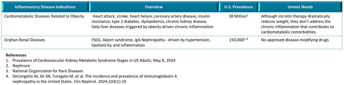 Our Inflammasome ASC Inhibitor IC 100 focuses on chronic inflammatory diseases. Our lead indication for IC 100 is cardiometabolic conditions associated with obesity. IC 100’s preclinical development is nearing completion. Our focus is on advancing IC 100 toward a currently planned IND submission in Q4-2026, followed by initiation of a Phase 1 trial in healthy overweight patients with a BMI between 27 – 30 at risk for cardiometabolic conditions. We are preparing to initiate IND-enabling preclinical studies in an animal model of diet-induced obesity, which develops metabolic complications, and an animal model representative of an orphan renal disease in Q2-2026.